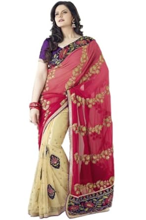 Amaranth Red and Cream Yellow embroidered party saree intricate with resham thread, zari thread, sequins work, floral work, leaf work and patch patti border work.Saree comes with an unstitch blouse piece which can be customised as per your requirement. Customisation includes changing front neck style, back neck style, increasing/reducing the length of sleeves.Accessories which is shown in the image is only for shooting purpose.There might be some color variation.Time to deliver: 25 days.