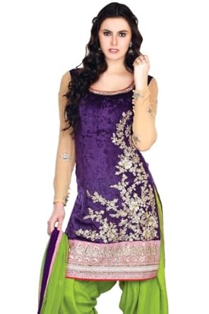Amethyst Violet and Green-yellow embroidered party salwar kameez intricate with zari thread, floral work, leaf work, sequins work, neck work and patch patti border work.This salwar kameez is unstitch and can be stitched upto chest size 42. Customisation includes changing front neck, back neck, sleeves style.Pyjama can be customise to salwar, churidar, patiyala, semi patiyala etc.Accessories which is shown in the image is only for shooting purpose.There might be some color variation.Time to deliver: 25 days.