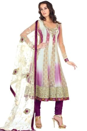 Beige Yellow and Byzantium Purple embroidered festival anarkali kameez intricate with zari thread, neck work, resham thread, floral work, leaf work, sequins work and patch patti border work.This anarkali kameez is unstitch and length of kameez can be stitched upto size 42. Customisation includes changing front neck style, back neck style, increasing/reducing the length of sleeves.Accessories which is shown in the image is only for shooting purpose.There might be some color variation.Time to deliver: 25 days.