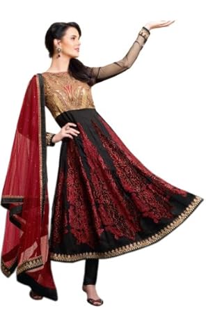 Black and Cardinal Red embroidered party anarkali kameez intricate with resham thread, zari thread, sequins, neck work, keri work, butta work, floral work and patch patti border work.This anarkali kameez is unstitch and length of kameez can be stitched upto size 42. Customisation includes changing front neck style, back neck style, increasing/reducing the length of sleeves.Accessories which is shown in the image is only for shooting purpose.There might be some color variation.Time to deliver: 25 days.