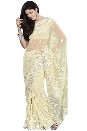 Cream Yellow embroidered party saree intricate with resham thread, sequins, floral work, leaf work and border work.Saree comes with an unstitch blouse piece which can be customised as per your requirement. Customisation includes changing front neck style, back neck style, increasing/reducing the length of sleeves.Accessories which is shown in the image is only for shooting purpose.There might be some color variation.Time to deliver: 10 days.