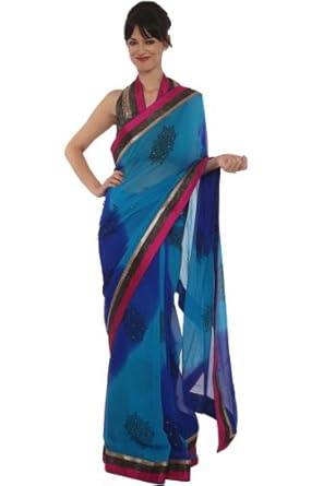 Deep Sky Blue and Persian Blue embroidered party saree intricate with zari thread, sequins, floral print and patch patti border work.Saree comes with an unstitch blouse piece which can be customised as per your requirement. Customisation includes changing front neck style, back neck style, increasing/reducing the length of sleeves.Accessories which is shown in the image is only for shooting purpose.There might be some color variation.Time to deliver: 15 days.