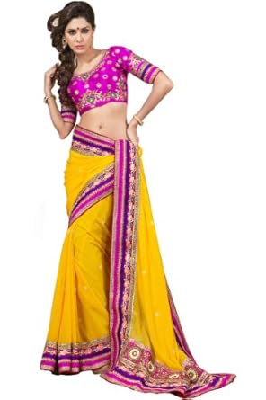 Golden Yellow embroidered party saree intricate with zari thread, resham thread, sequins, floral work, keri work and patch patti border work.Saree comes with an unstitch blouse piece which can be customised as per your requirement. Customisation includes changing front neck style, back neck style, increasing/reducing the length of sleeves.Accessories which is shown in the image is only for shooting purpose.There might be some color variation.Time to deliver: 25 days.