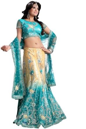 Peach Yellow and Deep Sky Blue embroidered wedding lehenga choli intricate with resham thread, zari thread, stone work, butta work, floral work, sequins and border work.This lehenga is unstitch and can be stitched upto chest size 42. Customisation includes changing front neck style, back neck style, increasing/reducing the length of sleeves.Accessories which is shown in the image is only for shooting purpose.There might be some color variation.Time to deliver: 25 days.