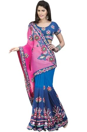 Persian Pink and Yale Blue embroidered party saree intricate with resham thread, sequins, floral work and patch patti border work.Saree comes with an unstitch blouse piece which can be customised as per your requirement. Customisation includes changing front neck style, back neck style, increasing/reducing the length of sleeves.Accessories which is shown in the image is only for shooting purpose.There might be some color variation.Time to deliver: 10 days.