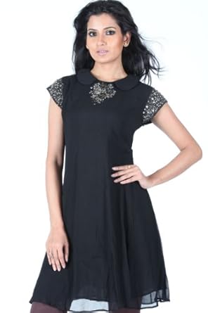 Black embroidered party kurti intricate with sequins, neck work and border work.This kurti is readymade and is available upto chest size 42.There might be some color variation.Time to deliver: 10 days.