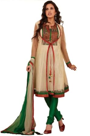 Enroll your wardrobe with this Beige and Green anarkali net churidar kameez is specially designed to make you look marvelous.It is intricately embroidered with resham and zari patch work design on kameez neck which make this outfit an unique piece.Grab this beautiful dress before this party season.Matching embroidered dupatta is also available with it.There might be some color variation.Time to deliver : 7 days.