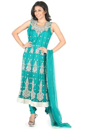 Turquoise Blue embroidered festival anarkali kameez intricate with zari thread, stone work, butti work, sequins, beads work, neck work and patch patti border.This ready made kameez is available upto chest size 36 with matching sleeves of 5-6 inches. If you want full sleeves then there are 2 choices:1) Full net sleeves @3usd. 2) Full georgette sleeves @5usd.Accessories which is shown in the image is only for shooting purpose.There might be some color variation.Time to deliver: 7 days.